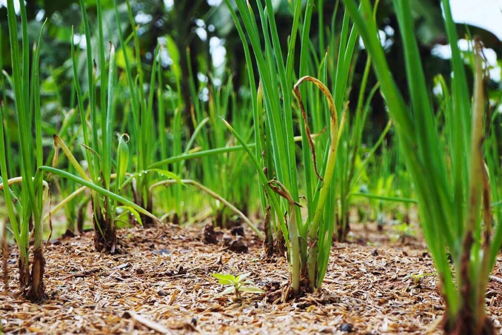 Green onion leaves grow upright and create a beautiful green curtain effect.