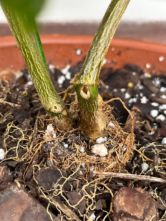 - White roots visible through the plastic
