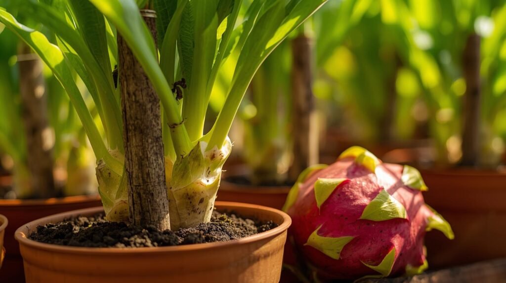 Dragon fruit plants require strong support such as poles or trellises for upright growth.